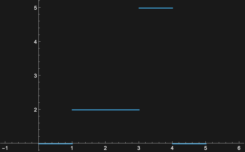 where for every region \(A_k\) is assigned the function value \(a_k\). Below is an example of a simple function, defined over \([0, 5]\).